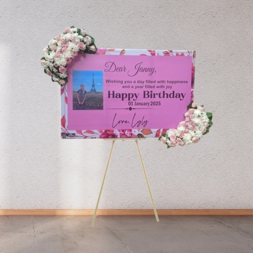 • Personalisasi Maksimal: Tambahkan sentuhan pribadi dengan logo perusahaan, foto, atau pesan khusus untuk membuat karangan bunga semakin bermakna.