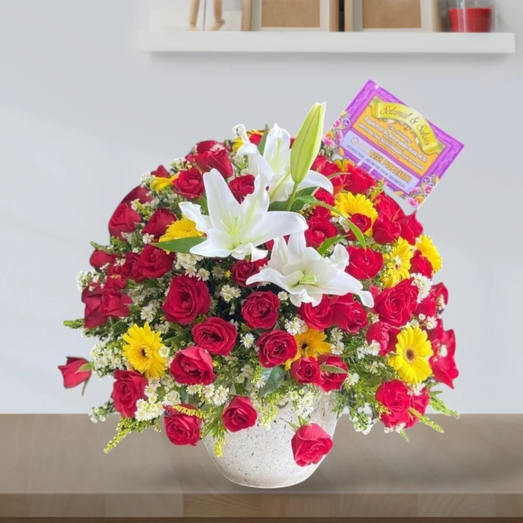 - Bunga Segar Pilihan: Kami menggunakan bunga-bunga segar berkualitas tinggi yang dipilih dengan cermat untuk memastikan keindahan dan ketahanannya.