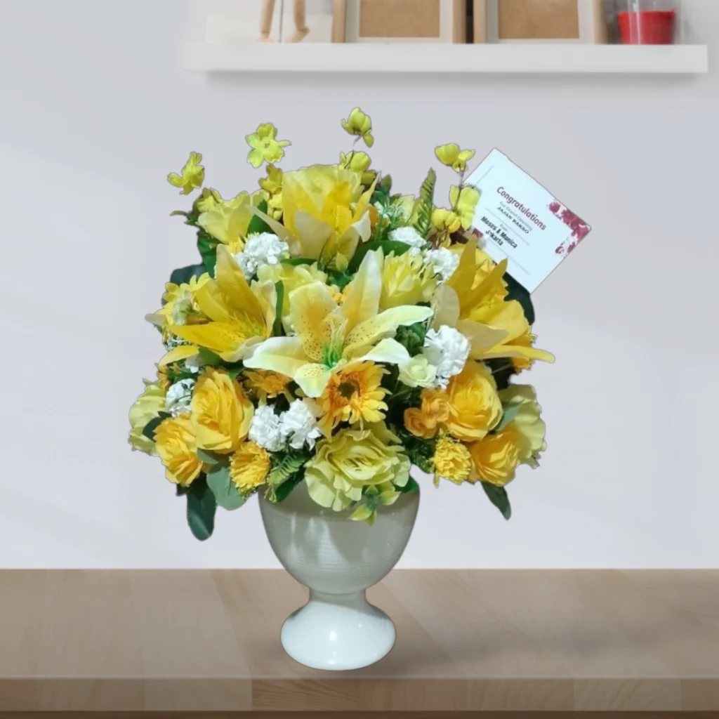 Untuk opsi yang lebih tahan lama, kami juga menyediakan rangkaian bunga meja dengan bunga artificial berkualitas tinggi. Untuk pemesanan bunga artificial, harap hubungi tim kami terlebih dahulu untuk konsultasi dan ketersediaan.