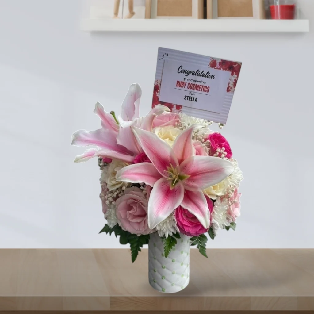 • Desain Custom yang Elegan: Ekspresikan gaya Anda dengan rangkaian yang didesain khusus. Anda dapat memilih jenis bunga, warna, dan gaya rangkaian sesuai dengan preferensi atau tema acara.